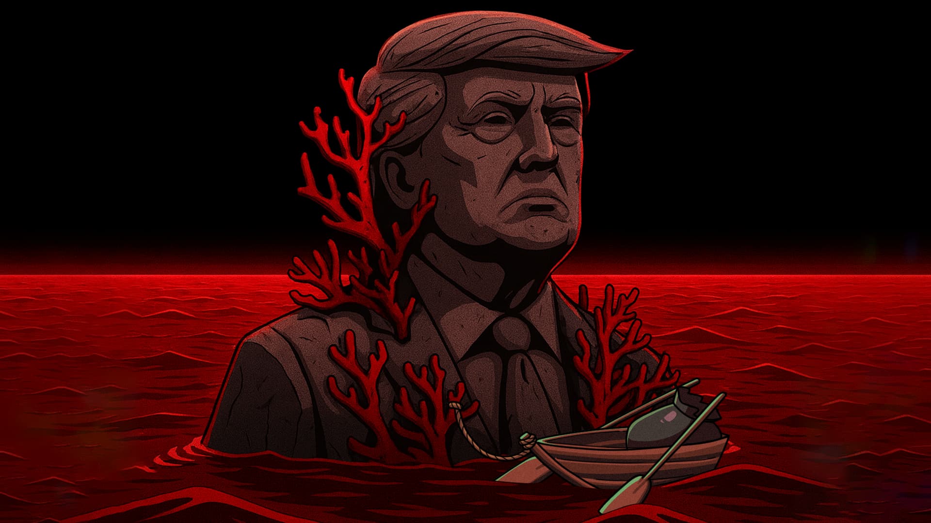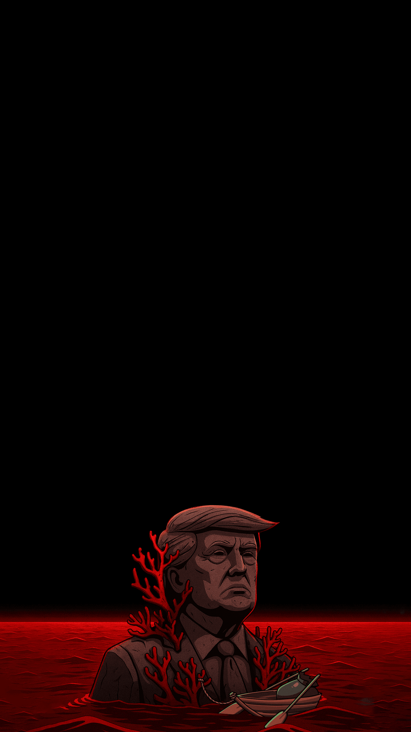 Endless black ocean under a blood-red sky. Half-sunken yachts, busted chests, banners from dead projects drift past.
